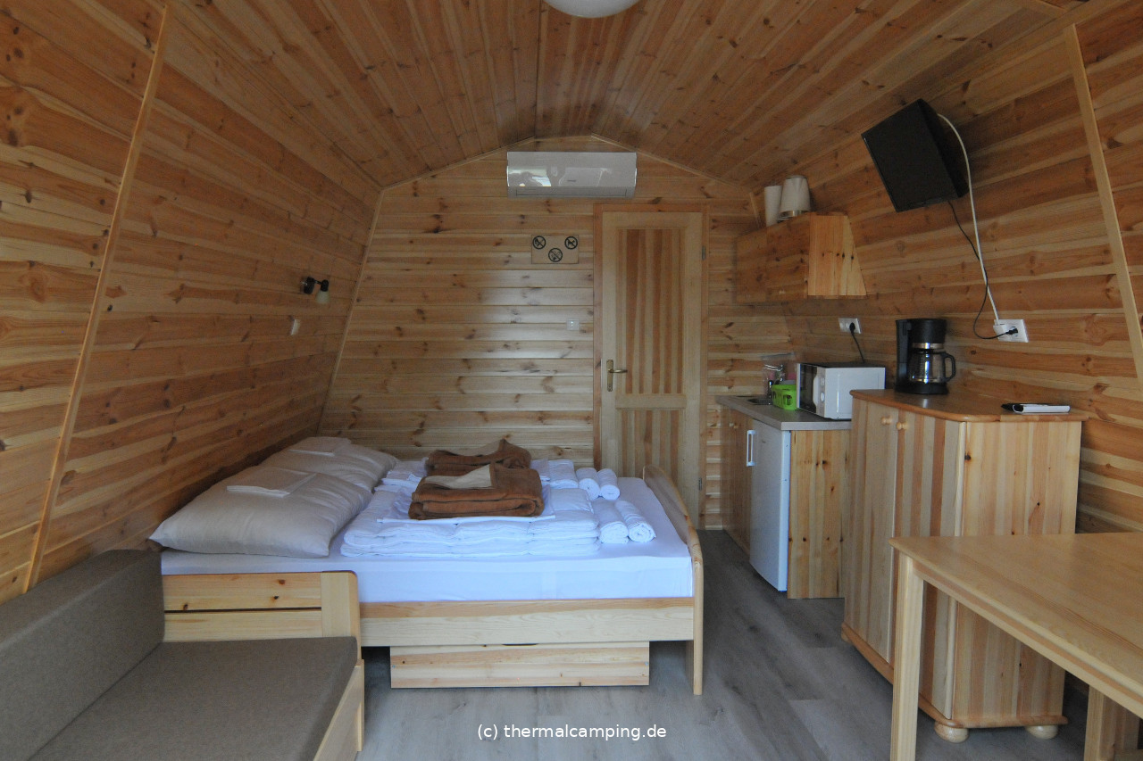 Wohn/Schlafraum: 1 Doppelbett mit Stauraum, 1 Sitzgelegenheit (ist ausziehbar und wird dann zu einem Doppelbett) mit Stauraum Klimaanlage mit Heizfunktion und Fernseher mit Radio.